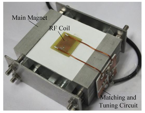 In this study, according to the characteristics of the composite insulator shed, a portable NMR sensor as shown in Figure 3, was designed. The sensor consists of a main magnet, RF coil, and matching and tuning circuits (Figure 3). The main magnet is used to generate the static magnetic field, , the RF coil is used to transmit the excitation signal along with the magnetic resonance signal from the sample that was received, and the matching and tuning circuit is used to achieve the impedance matching to adjust the resonant frequency to the Larmor frequency of the H atom.