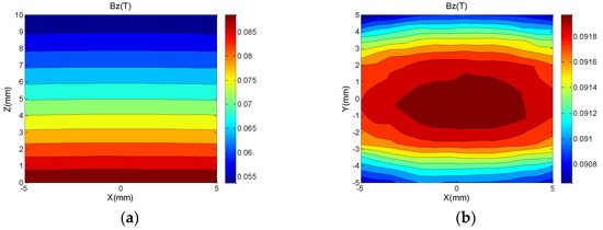 (a) Measured value magnetic field distribution in the area of 10 mm × 10 mm on XOZ plane y = 0 mm of ROI. (b) Measured value magnetic field distribution in the area of 10 mm × 10 mm on XOY plane z = 0 mm of ROI.