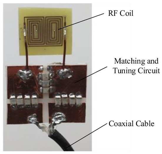 The main magnetic field in this study is perpendicular to the magnet structure, since the condition of magnetic resonance is that it be orthogonal to the RF magnetic field. The 8-shaped coil in Figure 6 that can produce a horizontal field is chosen to make the magnetic field produced by the RF coil, perpendicular to the main magnetic field . Additionally, the coil is formed of a double-layer PCB to increase the strength and uniformity of the RF magnetic field (the strength distribution of the RF magnetic field is shown in Figure 7), and the coil is made of a double-layer PCB. The coil is 22 mm long and 16 mm wide, with a total of 4.5 turns. The wire diameter is 0.5 mm, the wire spacing is 0.5 mm, the resistance is 916.5 mΩ, and the inductance is 1.15 mH.