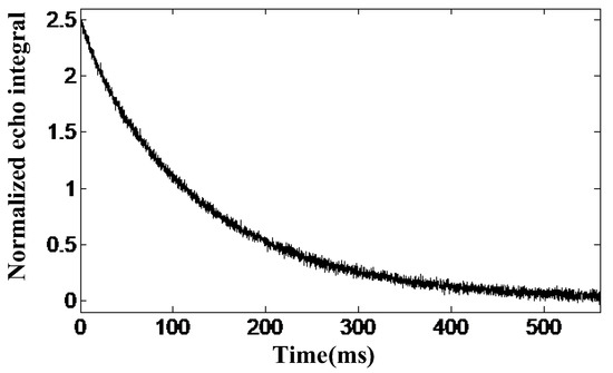 The two samples in the liquid–solid state were water and rubber, and the CPMG echo envelope obtained from the water sample test is shown in Figure 9. The T2eff value of pure water was 131.4 ms after fitting the curve to a single exponential. Under the same test conditions, the T2eff value of rubber was 12.1 ms. The results of the experiments demonstrate that the corresponding transverse relaxation time decays for liquids significantly more slowly than for solids, which initially validates the reliability of the sensor for measuring the T2eff value of the sample.