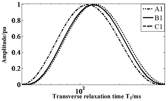 Figure 14 shows the distribution of transverse-relaxation-time spectra on the upper surface of the three insulators. The dotted (C1) and solid (B1) lines gradually shift to the left, compared with the dashed (A1) lines, marking the fact that the T2eff of the insulators gradually decreases as their service life increases. The T2eff of the three insulators are shown in Table 3, and the comparison reveals that the T2eff values of the new insulators are 4.47% higher than those of the insulators with 2 years of operation, and approximately 19.31% higher than those of the insulators with 5 years of operation