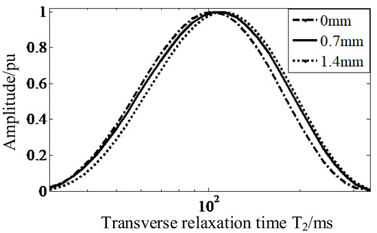 The surface material of the shed is inevitably more severely aged than its internal material. To distinguish this phenomenon of layered aging, the equivalent transverse relaxation time at different depths was measured on the upper surface of the insulator with 5 years of service, in this round of experiments. The measurement frequencies were set to 4.08 MHz, 3.97 MHz, and 3.86 MHz, and the corresponding measurement depths were 0 mm, 0.7 mm, and 1.4 mm, respectively. Figure 16 shows the distribution spectrum of transverse relaxation times measured at different depths of the samples.