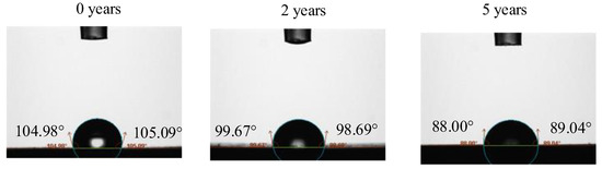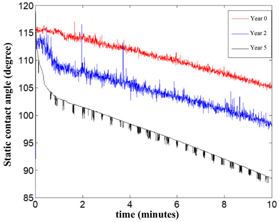 From the measurement results in Figure 18, with the extension of the measurement time, the water droplets on the solid surface evaporate continuously, and the droplet volume shrinkage becomes smaller; at the same time, due to the difference in the surface energy of the sample to be measured, the droplet spreads to different degrees, which means the contact angle tends to decrease. To reduce the influence of water evaporation, the average value of the three-time points of 9.5 min, 10 min, and 10.5 min (as shown in Figure 17, each time point measured the left and right two static-contact-angle values) was selected as the static-contact-angle value of the insulator sample, and the test results are shown in Table 6.