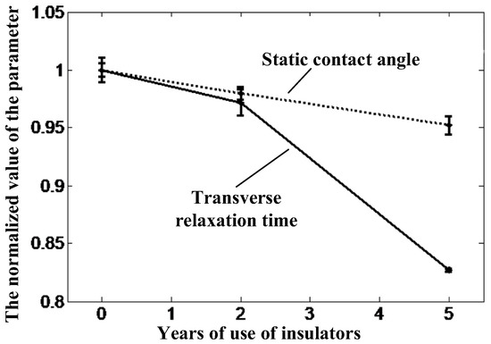 Figure 19 shows the normalized trends of T2eff and static-contact-angle-values on the upper surface of the three insulators, relative to the new insulator data. It can be seen that the trends of the data measured by the static contact angle method and the magnetic resonance method are the same. With the increase of the aging degree, both the static contact angle and T2eff show a decreasing trend, and the change of T2eff is more obvious, which makes it easier to distinguish the aging status of different insulators.