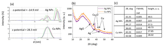 (a) DLS size distribution of Ag and Cu NPs with corresponding Z-potential values (green, red and purple lines represent the results of three measurements of the same samples); (b) XRD spectra of Ag (purple line) and Cu (orange line) NPs; (c) data of XRD pattern of Ag and Cu NPs.