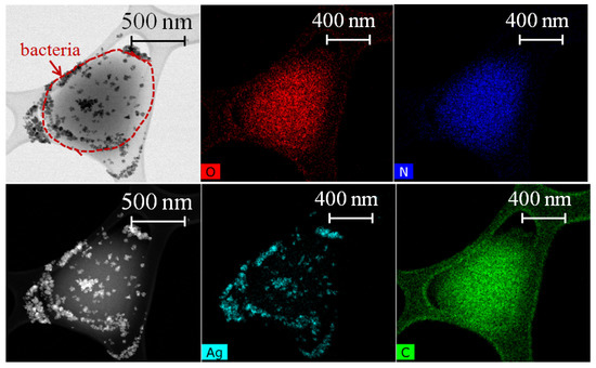 Likewise, Ag precipitate in area 3 (yellow) in Figure 6c,d is not seen in the corresponding EDS map. Areas 4 (yellow) and 5 (red) also have the same contrast, although while area 5 is clearly seen in the EDS map, area 4 is absent. This comparison also suggests the penetration of precipitates in the volume of bacterial cell.
