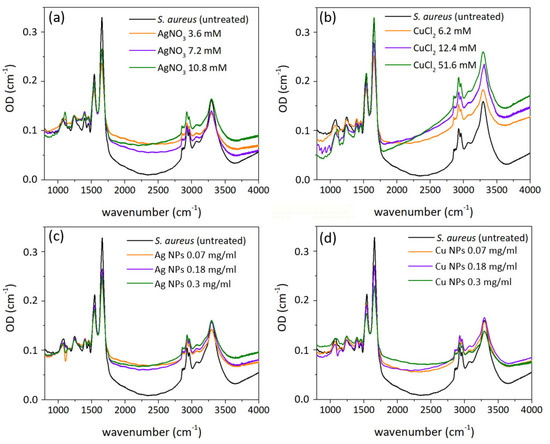 FT−IR optical density (OD) spectra of S. aureus before and after treatment with (a) AgNO3, (b) CuCl2, (c) Ag NPs, and (d) Cu NPs solutions with different concentrations.