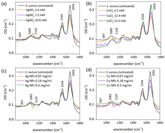 Selected regions (850–1800 cm−1) of FT−IR spectra of S. aureus before and after treatment with (a) AgNO3, (b) CuCl2, (c) Ag NPs, and (d) Cu NPs solutions with different concentrations.