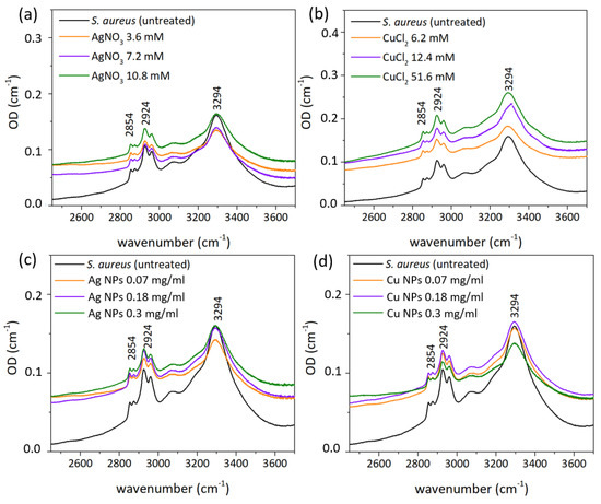 Selected regions (2450–3700 cm−1) of FT−IR spectra of S. aureus before and after treatment with (a) AgNO3, (b) CuCl2, (c) Ag NPs, and (d) Cu NPs solutions with different concentrations.
