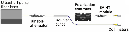 Figure 3 shows the experimental setup on which the ultrafast saturation measurement was performed. For measurements, we used homemade ML erbium-doped fiber lasers with a pulse duration of 180 fs and 300 fs and a pulse repetition rate of 42.2 MHz and 11.1 MHz, respectively [41,42]. The laser radiation was directed to the splitter, where it was divided into two optical channels at a ratio of 50/50, preliminarily passing through a tunable attenuator. The radiation in one port of the splitter was sent directly to the radiation receiver, and a polarization controller in the SAINT module with the HDWA-SWCNTs under study were installed on the second port.