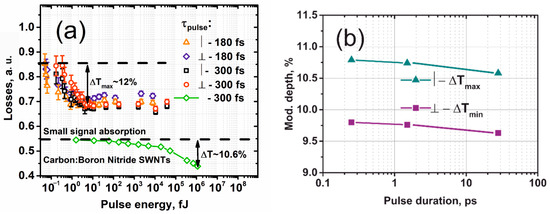 Figure 4a shows the measured loss function of an HDWA-SWCNT thin film absorber compared to a similar absorber based on boron nitride doped carbon nanotubes using either 180 or 300 fs full width half maximum (FWHM) pulses. We observed a polarization dependence (up to a 3% difference in optical losses for 2 orthogonal polarizations) of optical saturation, which is direct evidence of the ordered structure of HDWA-SWCNT, as well as a low level of saturation energy Esat of <1 fJ, limited to the detector threshold used, while the maximal modulation depth was ΔT ≈ 12%. Note that the power meter’s minimal detecting optical power was ≈300 pW (model MTP 6000, IIT BSIIR, Minsk, Belarus). We have also varied the ultrashort pulse durations (see Figure 4b) in the wide range of 0.25–28 ps (at the FWHM pulse intensity level) by controlling the length of the output fiber SMF-28 using a homemade ultrashort pulse fiber laser [41]. Moreover, carbon nanotubes, doped with boron nitride, serve as an ideal platform for creating laser saturated absorbers, as well as a short response time, from a high modulation depth [28,42,44]. However, compared to C:BNNT, high-density SWCNTs films have the advantage of a much lower level of saturation energy and higher resistance to radiation damage. It is also worth noting that during the experiments, we observed a dependence of the modulation depth on the duration of the irradiating pulses, which proves a shorter response time (tresp) for HDWA-SWCNTs compared to boron nitride-doped nanotubes. It should be mentioned that the observed response time of HDWA-SWCNTs shows good agreement with the ultrafast carrier dynamic measurements in SWCNTs obtained by the pump–probe method [45].