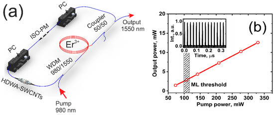 The ML threshold (see Figure 5b) was observed at an average pump power of ~104 mW. Moreover, we have not observed any pulse breakage by increasing the pump power up to 330 mW. It is worth noting that regarding such a low ML threshold, compared with NPE-based only, ML [41] is attributable to the applied hybrid ML technique in which the slow SA, represented by HDWA-SWCNTs SA, reliably triggers ML at a low pump power, while the pulse shortening is caused by the NPE effect [51]. It should be noted that the ML laser threshold corresponds well with the results of the PML (presented in Table 1) obtained by the ML technique based only on SWCNTs SAs for the significant value of unsaturated losses lns. This fact proves that the observed USP is generated mainly by the action of the HDWA-SWCNTs SA.