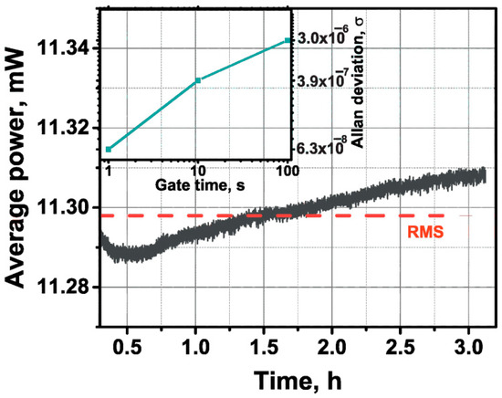 At last, to understand the long-term stability of the obtained ML generation regime, we measured the output average power stability at the nearly maximum available output average optical power of ~11.3 mW and the Allan deviation of the repetition rate (for 5 Hz data using the 53132A manufactured by Agilent Inc) of the free-running fiber laser. Figure 10 shows the stability of the average optical output power with a standard deviation of ~0.06% RMS over a time of 3 h (measured by a PM200 power meter with an InGaAs S145C detector manufactured by Thorlabs Inc., Bergkirchen, Germany). As can be seen from the inset in Figure 10, the developed laser also has a relatively low pulse repetition rate deviation, with a value of 6.3 × 10−8 for an interval of 1 s, which is only determined by the temperature drift during the average time interval of 1 × 102 s and environmental action. It should be noted that during the experiment, which lasted for several hours, we did not observe any pulse breakage or instability in the laser operation.