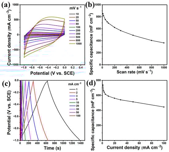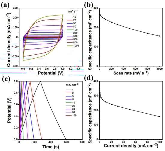 Initially, the three-electrode configuration was carried out to examine the CV and GCD. The CNTs/NF was used as the working electrode, and a Pt foil and an SCE were used as the counter and reference electrode, respectively. Figure 5a shows the CV curves of the CNTs/NF electrode at different scan rates from 10 to 1000 mV s−1, in a potential window of 0 to −1.0 VSCE, and Figure 5b shows the areal capacitances calculated from the CV curves. Figure 5c shows the corresponding GCD curves examined under different current densities from 1 mA cm−2 to 100 mA cm−2 in a potential window of 0 to −1.0 VSCE, and Figure 5d shows the areal capacitances calculated from the GCD curves. The highest specific capacitance values derived from the CV and GCD curves of three-electrode configuration were 852.5 mF cm−2 at the scan rate of 10 mV s−1 and 737.4 mF cm−2 at the current density of 1 mA cm−2, respectively. Both the CV and GCD results also maintained good capacitance retentions of 42.8% and 60.4%, after increasing CV scan rate and GCD current density by 100 times.