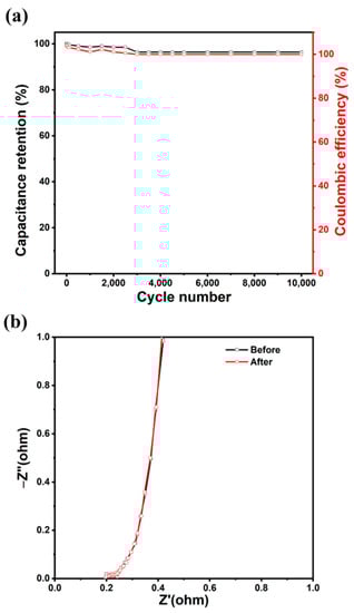The cycling stability of the CNTs/NF electrode was also measured using the GCD methods in the range of −1.0 to 0 VSCE at a current density of 30 mA cm−2 for 10,000 cycles. Figure 8a shows the capacitance retention and Coulombic efficiency as a function of the cycle number. After 10,000 cycles, the CNTs/NF electrode displays a significantly long cycle life, with a capacitance retention of 96.4% of its initial specific capacitance. Additionally, the Coulombic efficiency is used to evaluate the efficiency of electron transfer within an electrochemical system, according to the output/input charge ratio of an SC. The obtained Coulombic efficiency shown in Figure 8a is well maintained at ~100%, with a slight change in capacitance, indicating that the CNTs/NF electrode exhibited not only good cycling stability, but also low internal resistance. To further characterize the cycling performance, EIS was also carried out to record the Nyquist plots before and after the total 10,000 cycles of the test, as shown in Figure 8b. It was observed that the impedance results, before and after the total 10,000 cycling test, were almost the same, and the EIS results corresponded with the Coulombic efficiency from the cycling stability test. The excellent cycle performance is attributed to the stable structure of the direct growing CNTs, with a strong attachment to the NF current collector, ensuring the good mechanical and electrical connection between the NF collector and the CNTs.
