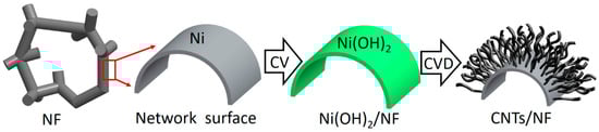 Ni(OH)2 was found to be the catalytic nanomaterial for the synthesis of CNTs at a low temperature of 450 °C via the CVD method, as was reported by Zeng’s group []. Ni(OH)2 can be easily fabricated via the hydrothermal method, the solvothermal method, and electrochemical treatment [,,,]. In regards to large-scale production for industrial fabrication, electrochemical treatments are currently widely used in this field. Additionally, the transition metal can be easily converted to metal hydroxide via redox reactions under the alkaline aqueous solution with electrochemical treatment, resulting in ion-exchange reactions []. Therefore, we herein report the synthesis of an Ni(OH)2 thin film, which was self-converted from an Ni foam (NF) substrate via the facile cyclic voltammetry (CV) method, to obtain the Ni(OH)2/NF and the subsequent direct growth of CNTs on NF by using the as-converted catalytic Ni(OH)2 thin film via a low-temperature CVD for the fabrication of a CNTs/NF electrode. By using this self-converted process via the electrochemical CV strategy, Ni(OH)2 thin films can be uniformly formed and coated onto the surface of NF networks for the subsequent effective distribution of growing CNTs to obtain the CNTs/NF electrode and achieve high-performance EDLC.