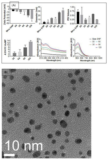The successful synthesis of AS1411-PEG co-conjugated GNPs was confirmed using zeta potential (mV), hydrodynamic diameter (nm), polydispersity indices (unitless), oligonucleotide number per GNP, and UV/visible spectroscopy as shown in Figure 3A. The top panel shows zeta potential, hydrodynamic diameter, and polydispersity indices for each particle synthesis. Zeta potential measurements help identify surface charges of nanoparticle syntheses and are used as a guideline for implying particle stability [60]. Generally, an increase in magnitude suggests a more stable particle synthesis allowing for the proper interaction between particles and biological molecules conjugated onto the surface. A gradual increase in zeta potential measurements is seen for all syntheses as AS1411 loading is increased. As designed, this loading is verified in the bottom panel of the figure, showing an increase in AS1411 loading across each synthesis. Benchmark values looked for from zeta potential measurements are usually any of those that are >20 mV in magnitude [61,62,63]. This would imply that 9X and 12X syntheses are the most stable, with zeta potential measurements reading −21.7 ± 4.57 mV and −33.5 ± 8.85 mV, respectively.