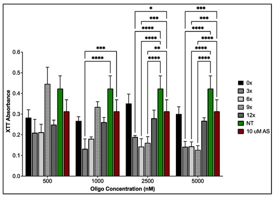 As measured by XTT assay, antiproliferative activity within U87MGs post-treatment with various PEG-AS1411 co-conjugated 4 nm GNPs. The legend shows particular particle syntheses for each concentration of oligonucleotide (AS1411) present within GNP syntheses. Groups treated with 0X represent the maximum amount of gold present within each concentration. NT represents non-treated control groups (media only). * represents p < 0.05, ** represents p < 0.01, *** represents p < 0.001, **** represents p < 0.0001.