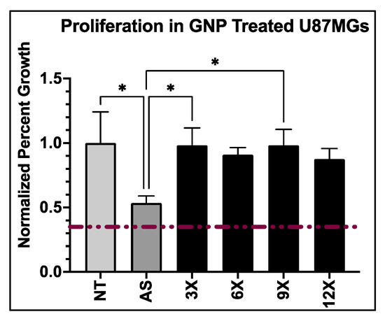 Proliferation activity, measured by cell viability, within U87MGs post-treatment with bare 4 nm GNPs representing maximal gold concentrations present within the solution for each particle type. * represents p < 0.05. The red line indicates the normalized initial cell seeding value.