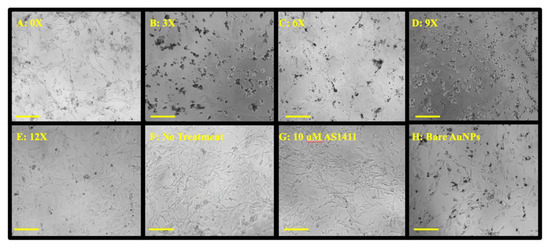 Morphological effects on U87MGs from treatment with co-conjugated PEG-AS1411 4 nm GNPs. Panels (A–E) represent 1 µM treatment groups. Panels (F–H) represent control groups. The scale bar indicates 100 microns.