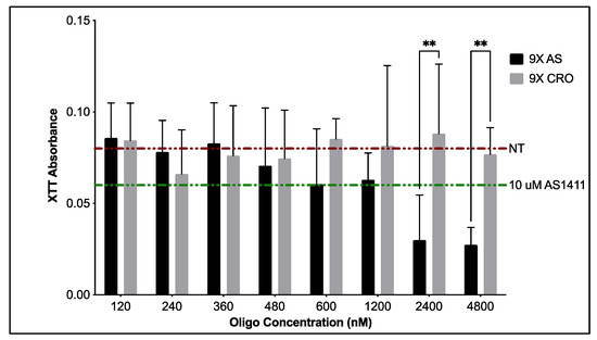 To verify that the effects seen from 9X GNPs are due to the anti-cancer aptamer AS1411, optimal GNP syntheses were generated with a control oligonucleotide, CRO, where each guanine base in AS1411 is replaced with cytosine. Unlike AS1411, the CRO sequence is not known to form quadruplex structures. XTT metabolic assays compared the bioactivity of 9X PEG-AS1411 4 nm GNPs to that of 9X PEG-CRO 4 nm GNPs (Figure 7). From this data, we can see the dose-dependent response on the decrease of antiproliferative activity from 9X GNPs bearing AS1411, ultimately leading to a 75.0% decrease in metabolic activity at concentrations close to 5 µM oligo when compared to the non-treated control. GNPs bearing CRO oligos cause only a 5% decrease in antiproliferative activity for U87MGs compared to the non-treated control. This value remains consistent for most concentrations tested with GNPs bearing CRO oligos. 9X 4 nm GNPs bearing AS1411 oligo begin to show significant effects on U87MG metabolic activity when compared to optimal 9X 4 nm GNPs bearing CRO oligo at higher concentrations of oligo (~2.5 and 5 µM), indicating their specificity towards anti-GBM like activity (p < 0.0012 and p < 0.0017, respectively). Further studies using non-cancerous, brain-related cells such as neural progenitor cells can confirm the specificity of AS1411-coated GNPs.