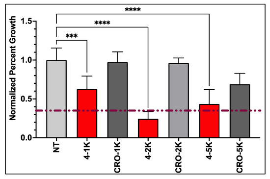 Proliferative effects at differing oligo concentrations on U87MGs from optimal 9X co-conjugated 4 nm GNPs conjugated with either PEG/AS1411 or PEG/CRO. Statistical significance of *** represents p < 0.0002 and **** represents p < 0.0001. No treatment (NT) and 10 µM AS1411 treatments serve as controls. Percent growth measurements normalized to initial seeding density (dashed red line).