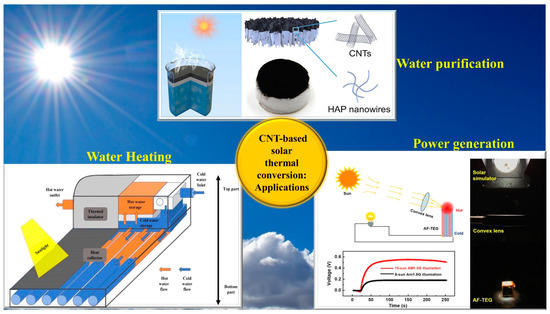 Although most experiments have been conducted in environments with 1 kW/m2 of sunlight (1 sun), this illumination level is insufficient for practical applications because solar irradiance can change from one place to another depending on the weather and climate conditions. Actual applications of solar thermal devices operating in environments with low (<1 kW/m2) and high (>1 kW/m2) radiation have substantial effects [29,30,32,33], which are described in the following sections in detail. In this review we provide a deep insight into CNT-based water purification, thermoelectric generation, water heating systems, and their practical implementation under different levels of solar power. In this article, we also aimed to identify a possible method of overcoming gaps in the research by investigating the use of CNT materials for thermal energy applications, thus addressing both UN Sustainable Development Goal 6: Clean water and sanitation [34] and Goal 7: Affordable and clean energy [35].