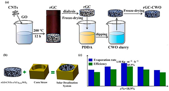 Aerogel is one possible solution to improve evaporation efficiency. Zhou et al. [50] reported that low vaporization enthalpy is an effective strategy for functioning solar water purification at low solar irradiation, which also follows Equation (1). Recently, Mu et al. [51] introduced nanoporous super-wetting hollow carbon nanotube (HCNT) aerogels that were super-hydrophilic following sulfuric acid treatment. This device exhibited an evaporation efficiency of 86.8% when exposed to one-sun illumination (1 sun = 1 kW/m2). Qin et al. [37] also employed a bilayer aerogel technique with hydrophilic ultralong hydroxyapatite (HAP) nanowire aerogel and a hydrophobic CNT coating to boost evaporation efficiency to 89.4% under one-sun illumination. They validated the possible applicability of the device in the removal of heavy metal ions from saltwater and wastewater. Li et al. [52] proposed a double-layer concave solar evaporator with an absorbing layer composed of Ti2O3 nanoparticles and CNT aerogel. They enhanced the effectiveness of evaporation to 92.4% and demonstrated the device’s capacity to cleanse water from wastewater containing chemicals or heavy ions. Xu et al. [53] prepared a modified shape, referred to as organohydrgel, doped with CNTs to purify oil-contaminated water under low sunlight illumination conditions. Li et al. [54] reported on the use of carbon-based hydrogels, rGC-constituted rGOs (reduced graphene oxides), and CNTs. They were synthesized using the hydrothermal technique, and cesium tungsten bronze nanoparticles were deposited on the surface of rGCs using an impregnation procedure. They used polydiallyl dimethyl ammonium chloride (PDDA) solution to alter the surface potential of the rGC aerogel. Nano-tungsten bronze aerogels (rGC-CWO) were prepared using the freeze-drying technique, as shown in Figure 4a. Then, the rGC-CWO aerogels were implanted in a corn straw (CS) substrate to construct rGC-CWO/CS evaporators, as shown in Figure 4b. Figure 4c shows that the rGC-CWO composite aerogels emitted considerable heat, and the water evaporation efficiency increased significantly to 85.9% in purifying seawater under weaker solar intensity (1 sun).