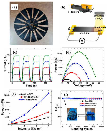 Recently, Li et al. [77] developed an organic solar thermoelectric generator (SP-TEG) utilizing heat rectifying junction-free trapezoidal structured p/n modules and CNT films as thermal conversion materials as shown in Figure 7a. Experiments were conducted to measure the performance of CNT films based on their solar thermoelectric characteristics. CNT film strips of 30 mm in length and 5 mm in width were attached between two copper electrodes. As illustrated in Figure 7b, sunlight irradiated one side of the CNT film, and an IR camera captured the generated voltage. Figure 7c shows that the current response to time exhibited a rising pattern, whereas Figure 7d shows an ascending power-voltage curve. Both figures were derived from the SP-TEG experiments shown in Figure 7b. These graphs were generated as the intensity of solar light grew from 1 to 4 suns. Due to the low internal resistance, the CNT-film TEG demonstrated a linear relationship with sunlight and increased voltage. The output power was calculated using the equation described by Liu et al. [79]. This device generated 1709.2 nW power under 4 suns under the same ambient conditions. The maximum output power under the abovementioned conditions increased quadratically with increasing light intensity, as shown in Figure 7e. In addition to their light-to-electricity conversion capabilities, the MWCNT-based TEGs demonstrated remarkable bending qualities. The conductivity of the flexible devices was unchanged even after one thousand bending cycles, as shown in Figure 7f. Table S4 summarizes the critical parameters that affect the performance of CNT-based solar thermoelectric generators when exposed to solar irradiation.