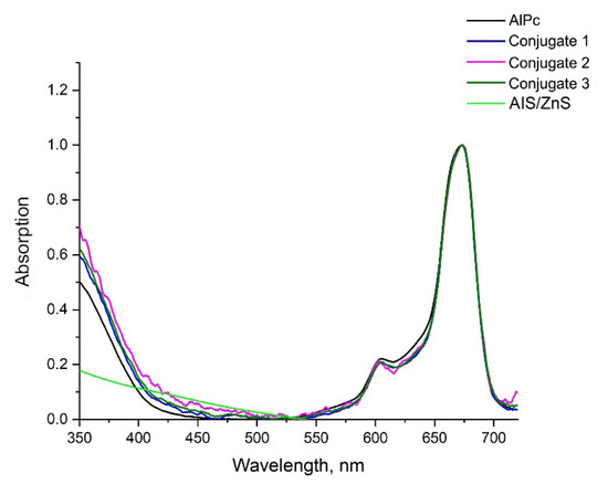 The luminescent properties of the obtained conjugates based on AIS/ZnS QDs, and PS AlPc were studied. For conjugate 1, conjugate 2, and conjugate 3, the molar ratios of QDs and PS correspond as: 1:6, 1:3, 1:6, respectively, which were determined by spectroscopic method. Figure 5 shows the absorption spectra of the conjugates, as well as the absorption spectra of free QDs and PSs.