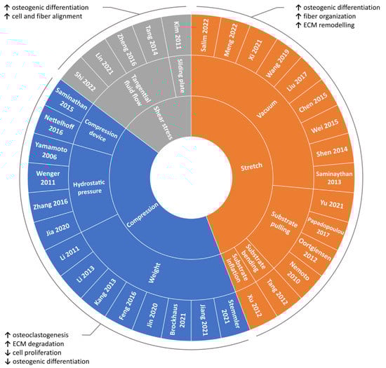 Overview of the reviewed in vitro PDL mechanical loading studies. Schematic summary of the reviewed studies investigating the influence of mechanical loading on PDL cells based on the type of applied stimulation along with main outcomes.
