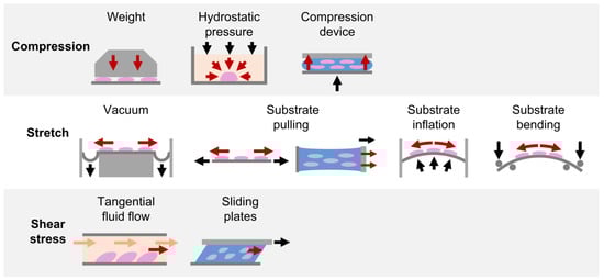 In vitro mechanical loading methods applied for PDL investigations. Schematic representation of the in vitro mechanical loading methods adopted in the reviewed studies for exposing PDL cells cultured in 2D layers or in 3D constructs to compression, stretch, and shear stress stimuli.