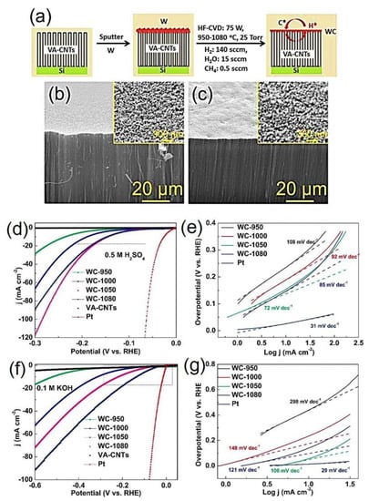 - Fan, X.; Zhou, H.; Guo, X. WC Nanocrystals Grown on Vertically Aligned Carbon Nanotubes: An Efficient and Stable Electrocatalyst for Hydrogen Evolution Reaction. ACS Nano 2015, 9, 5125–5134. [Google Scholar] [CrossRef]