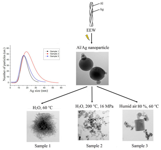 - Lozhkomoev, A.; Kazantsev, S.; Pervikov, A.; Fomenko, A.; Gotman, I. New approach to production of antimicrobial Al2O3-Ag nanocomposites by electrical explosion of two wires. Mater. Res. Bull. 2019, 119, 110545. [Google Scholar] [CrossRef]