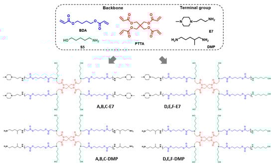 - Anderson, D.G.; Akinc, A.; Hossain, N.; Langer, R. Structure/property studies of polymeric gene delivery using a library of poly(β-amino esters). Mol. Ther. 2005, 11, 426–434. [Google Scholar] [CrossRef]