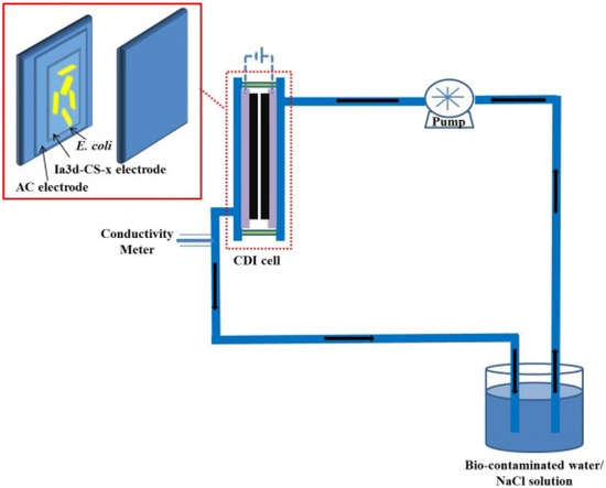 The CDI device consisted of four main firmware: a DC power supply, a conductivity monitor, a peristaltic pump, and a CDI cell (Figure 1). The CDI cell included four main parts: end plates, soft silica gel plates, electrodes, and a spacer. The bio-contaminated water/NaCl was pumped into the CDI device at a flow rate of 12 mL/min under 1.2 V.