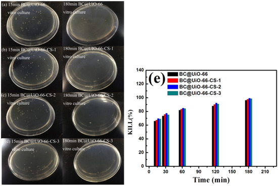 Figure 8 shows E. coli results for samples cultured in vitro for 15 min and 180 min. Figure 8a–d show that E. coli colony numbers significantly decreased after in vitro culture, indicating that E. coli was adsorbed and killed by the material during in vitro culture. Data presented in Figure 8e show that the percentage of E. coli killed increased as in vitro culture time increased, which further indicated that the material had a good bactericidal effect on E. coli. The BC@UiO-66-CS-2 material’s percentage of E. coli kills was the most significant, ranging from 68.94% to 98.48%, which was higher than those of the other materials were.