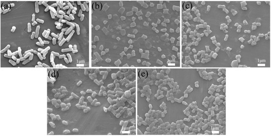 To further examine E. coli’s morphological changes during in vitro culture, it was observed using SEM after 60 min in vitro culture. E. coli’s morphology changed significantly from Figure 9a–e. First, its surface changed from smooth to wrinkled. Second, its length changed, and obvious defects appeared at both ends. This indicated that after 60 min of in vitro culture, E. coli’s surface was damaged by the physical action of the samples’ raw edges, and that chitosan’s action destroyed E. coli’s cell membrane, resulting in its death.