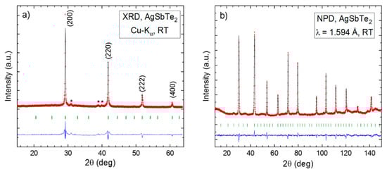 (a) XRD and (b) NPD patterns of AgSbTe2 at room temperature. The experimental points are shown in red, the calculated model in black and the difference in blue. The star denotes the known impurities detected in the X-ray pattern.