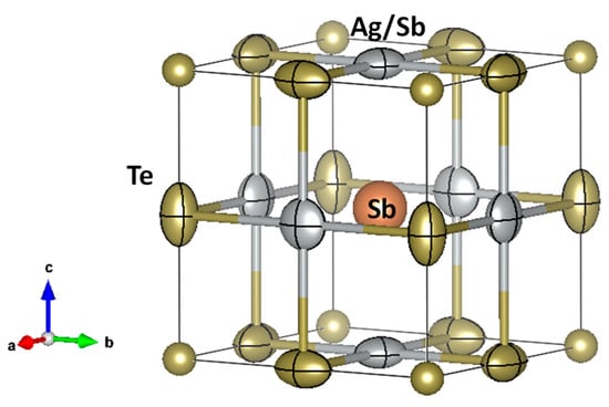 A slight Te deficiency at the 3d position is observed, which agrees with some Te volatilization during the arc-melting process, and these anion vacancies will increase the Fermi level and electron concentration. Figure 2 illustrates a view of the Pmm crystal structure, with the anisotropic atomic displacement ellipsoids (ADPs) for the 3c and 3d sites. This is a rock-salt-like structure, with Te and Sb as contiguous atoms and SbX6 (X = Ag, Sb) and TeTe2X4 octahedra. It is noteworthy that this model provides only one bonding distance, equivalent for every position. The highly anisotropic ADPs reflect the strong anharmonic bonding, which in turn has been ascribed to the lone s2 pair effect of Sb atoms [25]. The flat ellipsoids are perpendicular to the Sb-X bond and the elongated 3d-Te ellipsoids suggest more labile Te-Te, Ag/Sb-Te interactions and stronger Ag/Sb-Sb bonds, as well as repulsion effects with the origin at the 1b-Sb position.