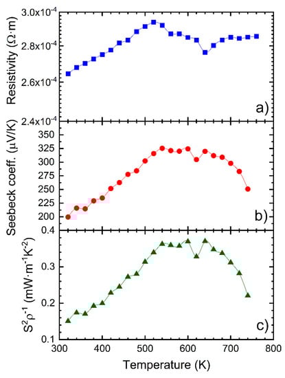 The power factor (Figure 4c) follows the Seebeck coefficient evolution with maximum values close to 0.4 mW·m−1·K−2, in the range from 540 to 640 K [31,62,63]. These values are comparable to those reported in the literature (0.5–0.8), slightly limited by the higher electrical resistivity. AgSbTe2 presents a melting point slightly above ~800 K, and thus, the measurements have been performed up to ~760 K, to ensure the reproducibility of the results.