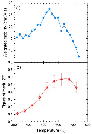 In Figure 6a, the weighted mobility dependence on the temperature is shown. It increases up to 520–550 K, when the cationic disorder at a high temperature increases the carrier scattering. These values are much closer to those reported for the hole-mobility (~15 cm2 V−1 s−1), while much lower than those found for the electron mobility (~104 cm2 V−1 s−1), as the heavy p-type band is the main contribution to the Seebeck coefficient. The maximum weighted mobility is consistent with the temperature evolution of the Seebeck coefficient and the resistivity, showing the significance of the cationic ordering in the electrical transport properties [31].