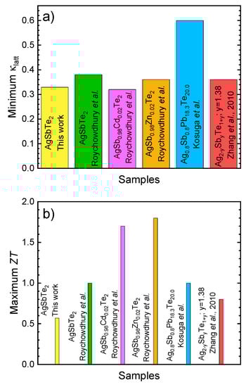 (a) Maximum thermoelectric figure of merit, ZT, and (b) minimum lattice thermal conductivity for several tellurides [31,61,67,68], compared with the composition analyzed in this work, AgSbTe2.