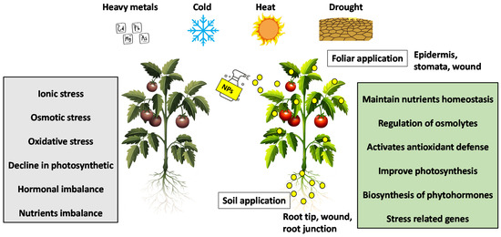 Since the turn of the century, the earth’s average temperature has risen [63]. Global warming can adversely affect the environment because of the increase in the temperature of the earth. In climates where temperatures exceed the ideal range, crops begin to yield less. Extreme climate change can cause high temperatures and drought, causing severe damage to agriculture and posing a threat to tree populations [64]. NPs are sourced from heavy metals which can cause environmental degradation by their toxic effects on soil, water, and plant resources [65,66]. The primary translocation of NPs from soil to plant body occurs through lateral roots. The NPs travel within xylem tissues and reach the whole plant body [52]. The translocation depends upon the size of the NPs. The contrastingly positive effect of NPs in mitigating abiotic stress has also been reported. Different NPs for field applications such as nano-agrochemicals have been used to increase agricultural productivity. Temperature extremes negatively affect plants’ physiological and molecular mechanisms [63,67].