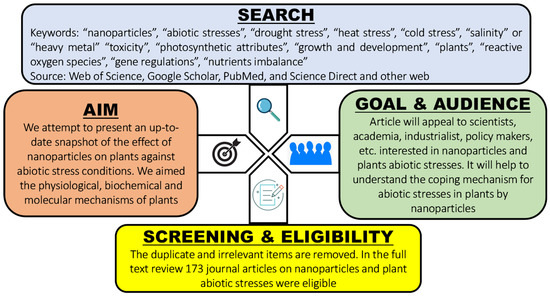 The current review study extensively covers MEDLINE and other published literature between 2015 and 2022 (until July), reporting the effect of NPs on plant growth and physiology under different abiotic stresses caused by climate change. The impact of nanoparticles has recently been documented in novel ways. In this review, each scientific article was critically reviewed for its method, result, and conclusion when discussing specific NPs. The search was performed in the databases “Google Scholar”, “PubMed”, and “Web of Science”, using different keywords. Consequently, this review summarizes and consolidates the current research findings about NPs in the following areas: (1) response of plants to abiotic stresses and their mitigation strategies using NPs; (2) the physiological and growth attributes of major abiotic stresses, i.e., drought, temperature extremities, salinity, and heavy metals; and (3) the biochemical and molecular responses of plants when exposed to NPs under abiotic stress conditions. We provide a detailed assessment of the effect of NPs on plant mechanisms under abiotic stresses. However, despite our efforts, we were unable to cover every aspect thoroughly. Concisely, the review approach was as follows. The keywords “NPs”, “abiotic stresses”, “drought stress”, “heat stress”, “cold stress”, “salinity” or “heavy metal” “toxicity”, “photosynthetic attributes”, “growth and development”, “plants”, “reactive oxygen species”, and “gene regulations” were selected individually or jointly. Scientific literature, preferably spanning between 2015 and 2022 (until July), was assimilated and reviewed. Figure 2 shows a schematic diagram depicting the decision-making process for the selection of appropriate journal articles and the scope of the review. Each selected article was then explained in terms of its key concepts.