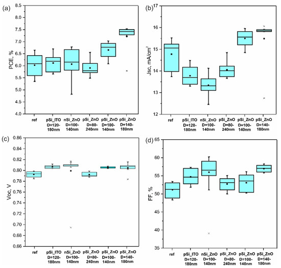 - Usmani, B.; Ranjan, R.; Prateek; Gupta, S.K.; Gupta, R.K.; Nalwa, K.S.; Garg, A. Inverted PTB7-Th:PC71BM organic solar cells with 11.8% PCE via incorporation of gold nanoparticles in ZnO electron transport layer. Sol. Energy 2021, 214, 220–230. [Google Scholar] [CrossRef]