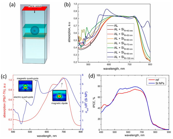 - Furasova, A.; Voroshilov, P.; Lamanna, E.; Mozharov, A.; Tsypkin, A.; Mukhin, I.; Barettin, D.; Ladutenko, K.; Zakhidov, A.; Di Carlo, A.; et al. Engineering the charge transport properties of resonant silicon nanoparticles in perovskite solar cells. Energy Technol. 2020, 8, 1900877. [Google Scholar] [CrossRef]