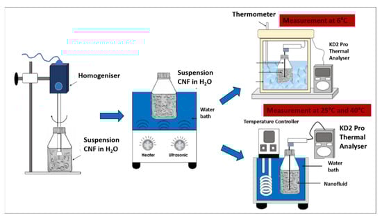 The CNF nanoparticles were physically dispersed in the water-based nanofluid via the two-step homogenisation and sonication process using a D1000 Handheld Homogeniser (Benchmark Scientific Inc., Sayreville, USA) for 5 min at a rotation speed of 10,000 rpm, followed by an FB 15057 Ultrasonic Water Bath (Fisher Scientific, Massachusetts, USA) for 30 min at 25 °C and 60 Hz with an output power generation of 240 W. The two-step process was crucial to ensure that the carbon particles in the water-based nanofluids are uniformly dispersed and prevent the agglomeration of the nanofluids through the breakdown of the van der Waals interaction between the particles. Figure 2 illustrates the process flow diagram of the preparation and evaluation of the surface-oxidised CNF-based nanofluids.