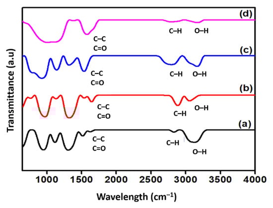 FTIR spectra of (a) commercial CNF and the surface-oxidised (b) CNF-MA; (c) CNF-MB; and (d) CNF-MC.