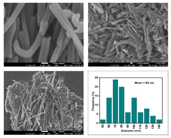 FESEM images of the CNF-MA at 100, 30, and 10 resolutions and their corresponding diameter distribution histogram (mean diameter = 90 nm).